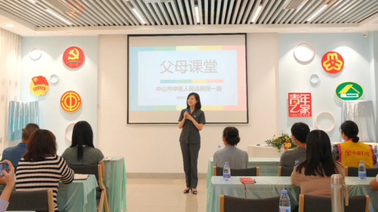 ▲鐘勁松在中山小欖開展“父母課堂”走進鎮街村居系列活動,為婦聯、綜治辦及當事人父母開展授課與集中調解