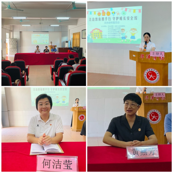 守護(hù)成長(zhǎng)安全線”為主題的法治宣講進(jìn)校園活動(dòng)。本次活動(dòng)由辦公室李夢(mèng)桃主任主持。中山市第二人民法院、黃圃華洋學(xué)校法治副校長(zhǎng)黃燕芳法官、