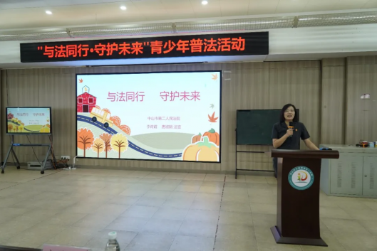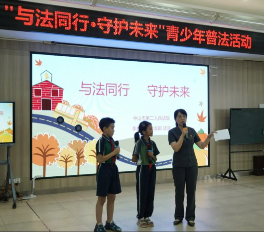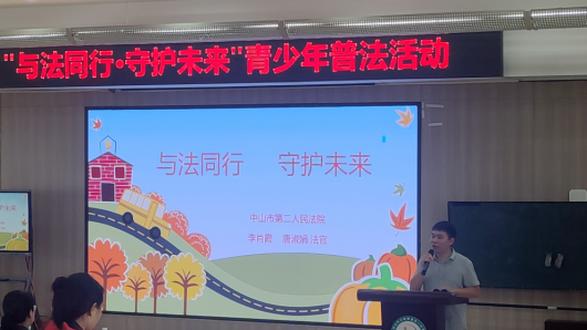 近日,為關心關愛在校青少年健康成長,引導他們提高法律認識,加強對自身保護,績東一社區在中山市第二人民法院支持下,在績東一小學舉行了一場主題為“與法同行·守護未來”的青少年普法活動,績東一小學師生近200人參加,績東一社區黨委委員霍志鴻主持活動。