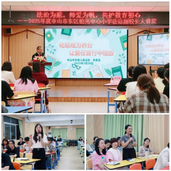 在東區柏苑中心小學,中山市中級人民法院審判監督庭庭長李勇源法官作為法治副校長為學校全體教師開講“法治為舵,師愛為帆,共護教育初心”的專題法律講座,李法官強調,在孩子成長的畫卷上,愛始終是不變的底色,懲戒既要畫出邊界的線條,也留出綻放的空白,孩子才能身心健康成長。