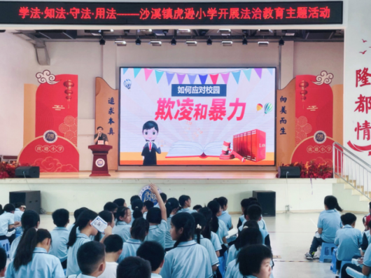 在沙溪鎮虎遜小學,市第二法院綜合審判庭庭長瞿兵為高年級同學們作法治安全教育講座。瞿法官以通俗易懂的語言,結合真實且發人深省的案例,深入淺出地講解了與小學生日常學習生活緊密相關的法律知識。在場同學們全神貫注,踴躍互動。